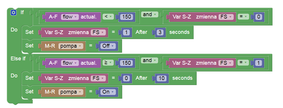 On ads#flow>=160 Do TimerSet,1,3 TimerSet,2,0 // kasuje timer wyłączenia Endon On ads#flow<140 Do TimerSet,2,5 TimerSet,1,0 // kasuje timer włączenia Endon