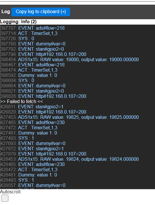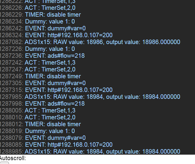 On System#Boot Do GPIO,2,1 // przekaźnik OFF po starcie Endon // ===== WŁĄCZANIE (flow < 140) ====== On ads#flow<140 Do TimerSet,2,10 // wysoki przepływ musi trwać 10 s Endon On Rules#Timer=2 Do GPIO,2,0 // ON przekaźnik Endon // ===== WYŁĄCZANIE (flow >= 160) ====== On ads#flow>=160 Do TimerSet,1,5 // niski przepływ musi trwać 5 s Endon On Rules#Timer=1 Do GPIO,2,1 // OFF przekaźnik Endon