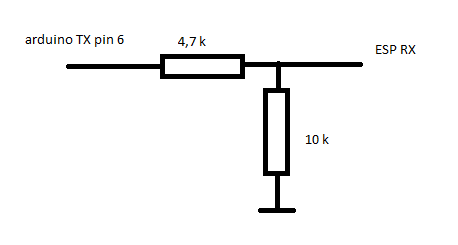 z arduino z pinu 6 (TX) poprzez dzielnik napięcia idzie na RX ESP (musi być zapewnione 3,3V)