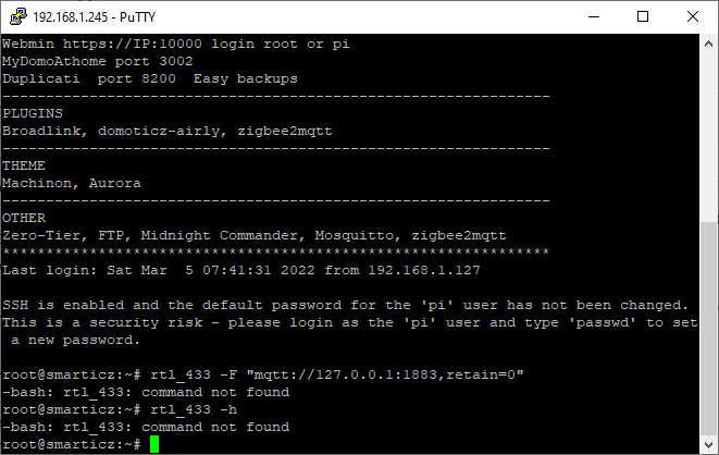 Status: Rtl433: rtl_433 startup failed. Make sure it's properly installed (rtl_433 -F csv -M newmodel -C si 2>/dev/null). https://github.com/merbanan/rtl_433