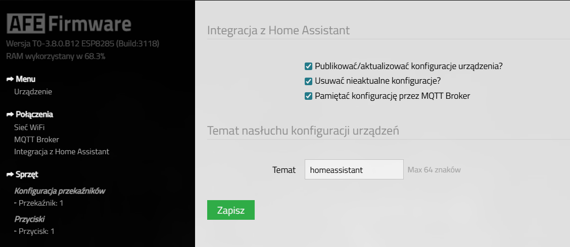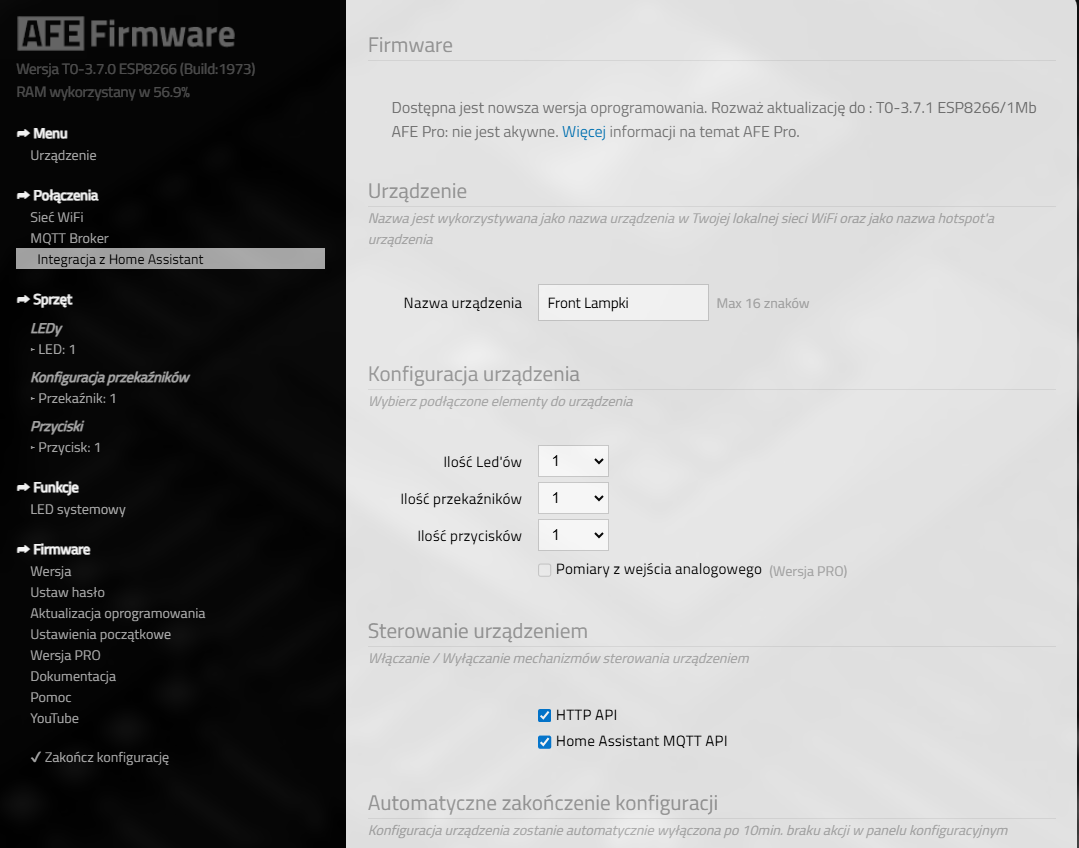 Uruchomiłem więc swój przełącznik Sonoff R4 z wcześniej wgranym FW AFE, i tak naprawdę tu utknąłem.
