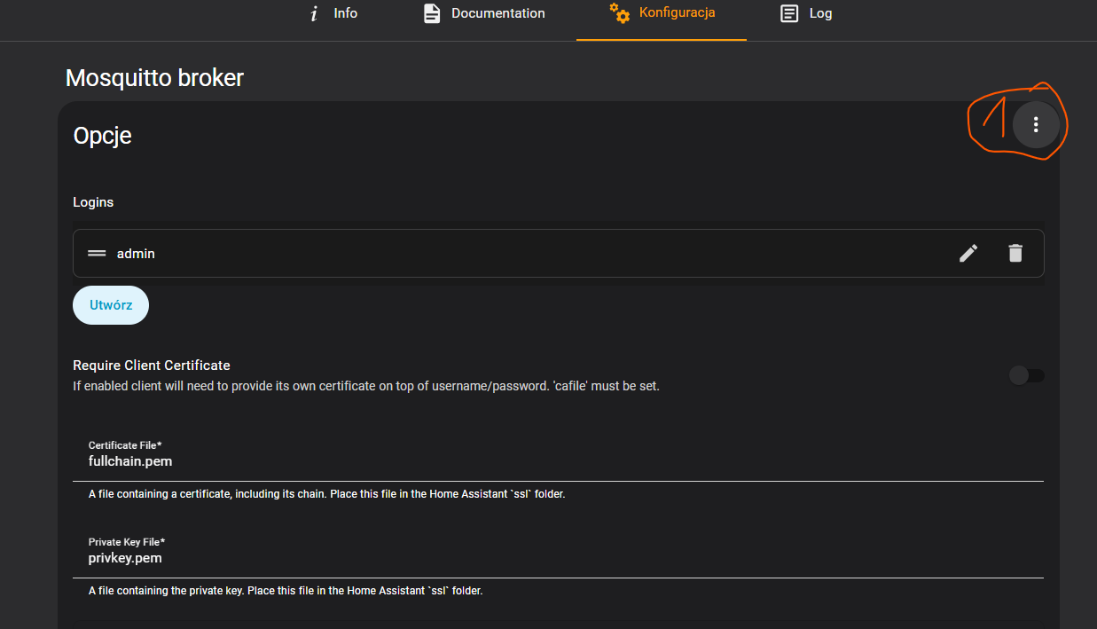 Jeżeli nie robiłeś tego sam albo powierzyłeś ustawienie hasła samemu HA to user: homeassistant , a hasło to bardzo długi ciąg znaków utworzony przez system. Najlepiej zatrzymać dodatek MQTT Broker, wejść w konfigurację dodatku kliknąć to co zaznaczyłem