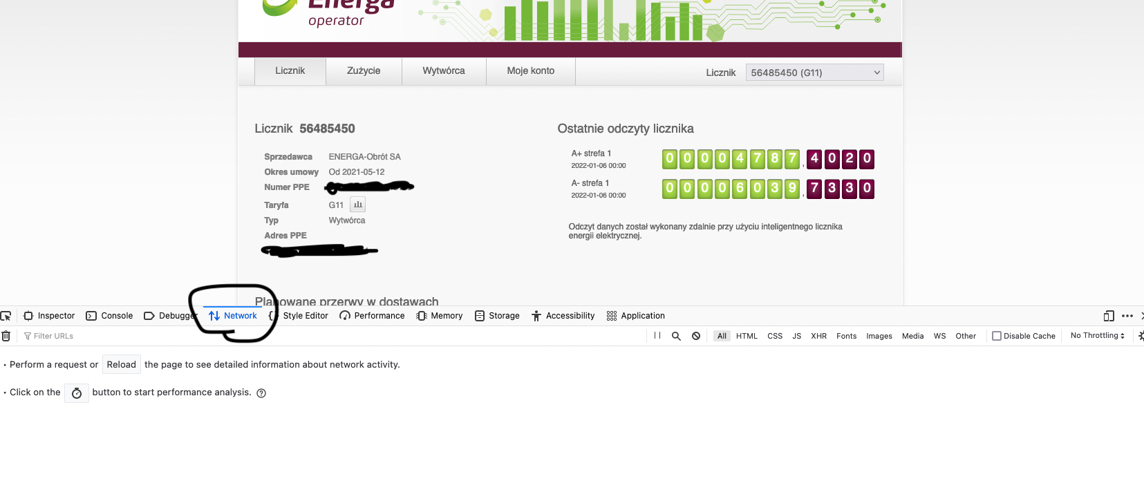 Po zmianie licznika powinien się tam jakiś request pojawić. Wtedy do flow w node-red trzeba będzie dodać kolejny http request na bazie tego co widać w inspektorze (podejrzewam że w request headers bedzie jakaś właściwość wskazująca licznik albo coś w requestowanym linku bedzie sugerowac ktory to licznik.