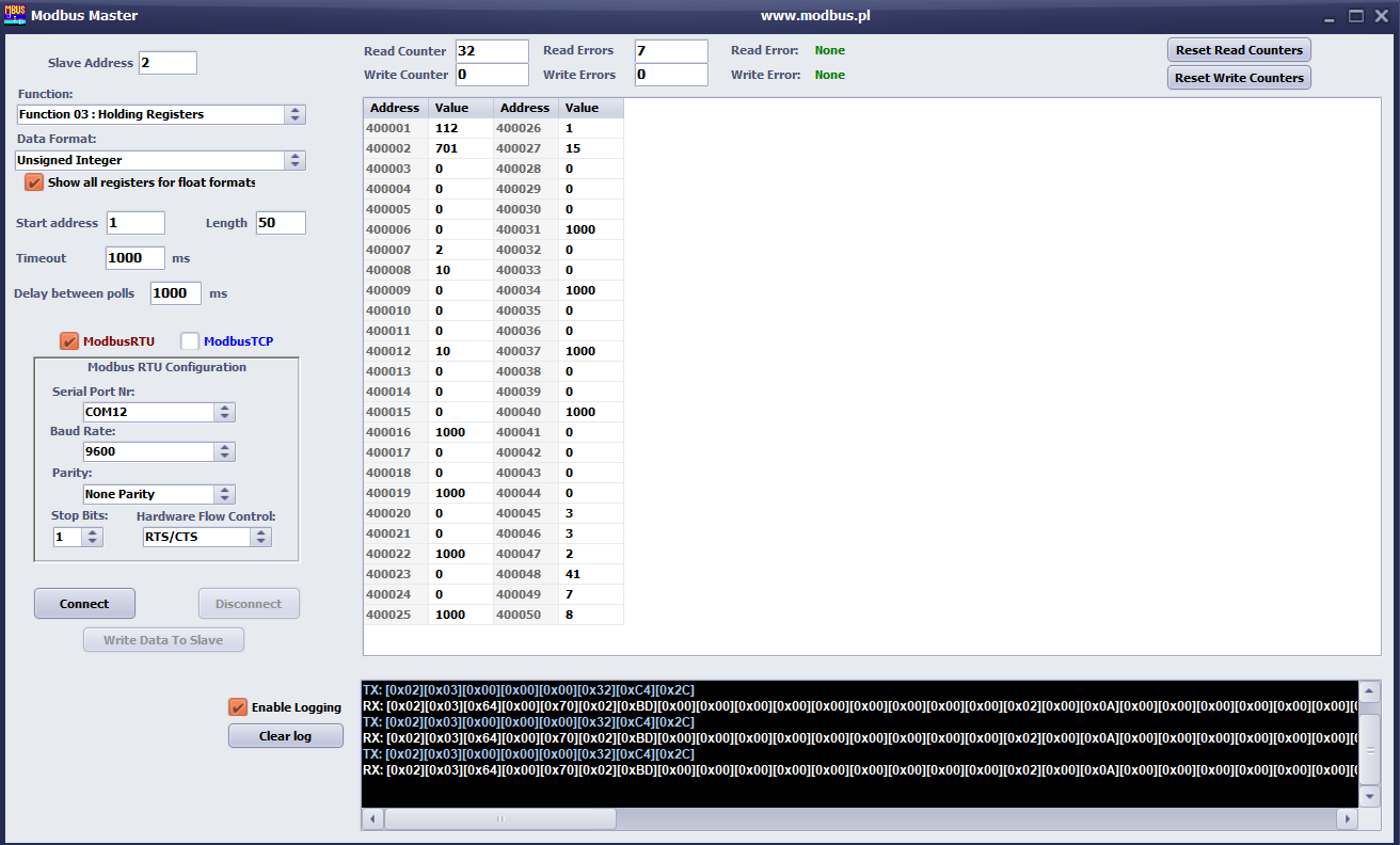 Licznik mam połączony przez serwer TCP, jest to drugie urządzenie więc ustawiłem slave ID na 2 i jest komunikacja, posiłkuje się tabelą rejestru:
