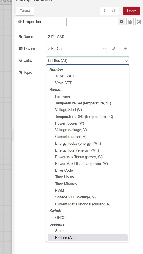 Chcąc odczytać parametry urządzenia wykorzystujesz node esphome-in , przykład/