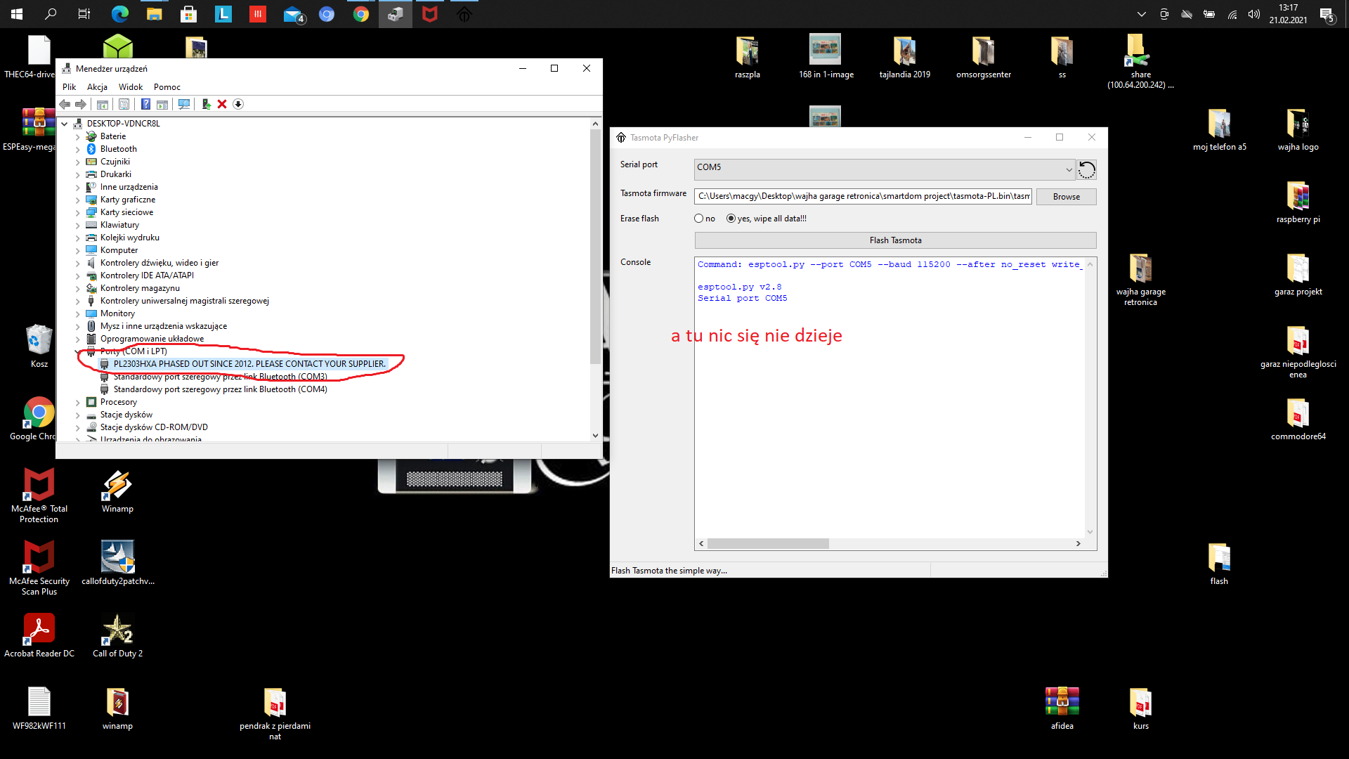 @wajhagarage masz niedostępny port com , czy zwierasz GPIO 0 do masy przed podaniem zasilania ? Użyj sobie tego https://github.com/tasmota/tasmota-pyflasher