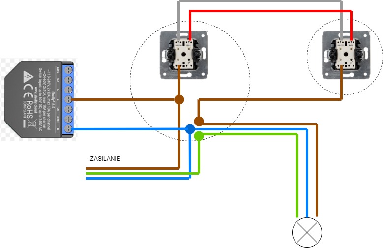 Do istniejacej instalacji elektrycznej chciałbym dodać przekaźnik Shelly 2.5 by móc zdalnie sterować oświetleniem w pomieszczeniu, w którym zainstalowane są dwa łączniki schodowe pojedyncze, podpięte do jednego źródła światła.