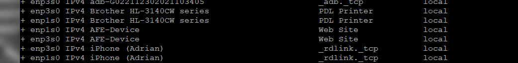 pi@home:~ $ avahi-browse _ewelink._tcp + eth0 IPv4 eWeLink_100143717c _ewelink._tcp local + eth0 IPv4 eWeLink_10015f76a9 _ewelink._tcp local + eth0 IPv4 eWeLink_1001556e33 _ewelink._tcp local + eth0 IPv4 eWeLink_10015f7add _ewelink._tcp local + eth0 IPv4 eWeLink_10015f76c7 _ewelink._tcp local + eth0 IPv4 eWeLink_10015f7aa5 _ewelink._tcp local + eth0 IPv4 eWeLink_10015f76b5 _ewelink._tcp local