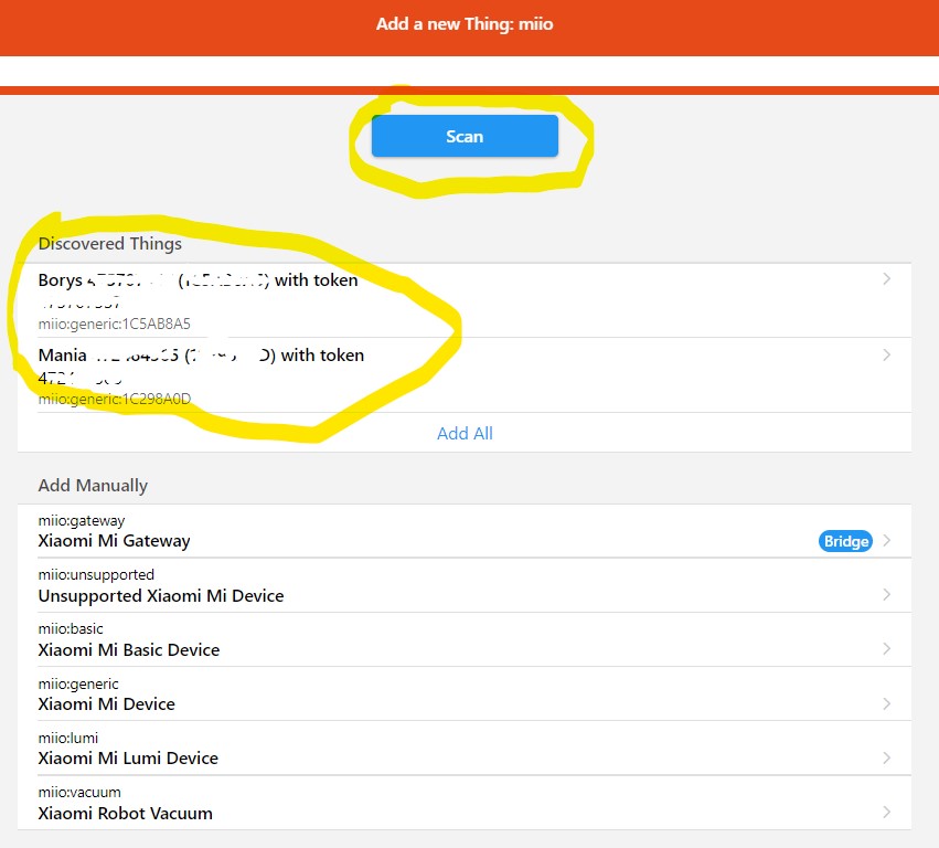 - wybranie opcji: Discover all online devices from Xiaomi cloud