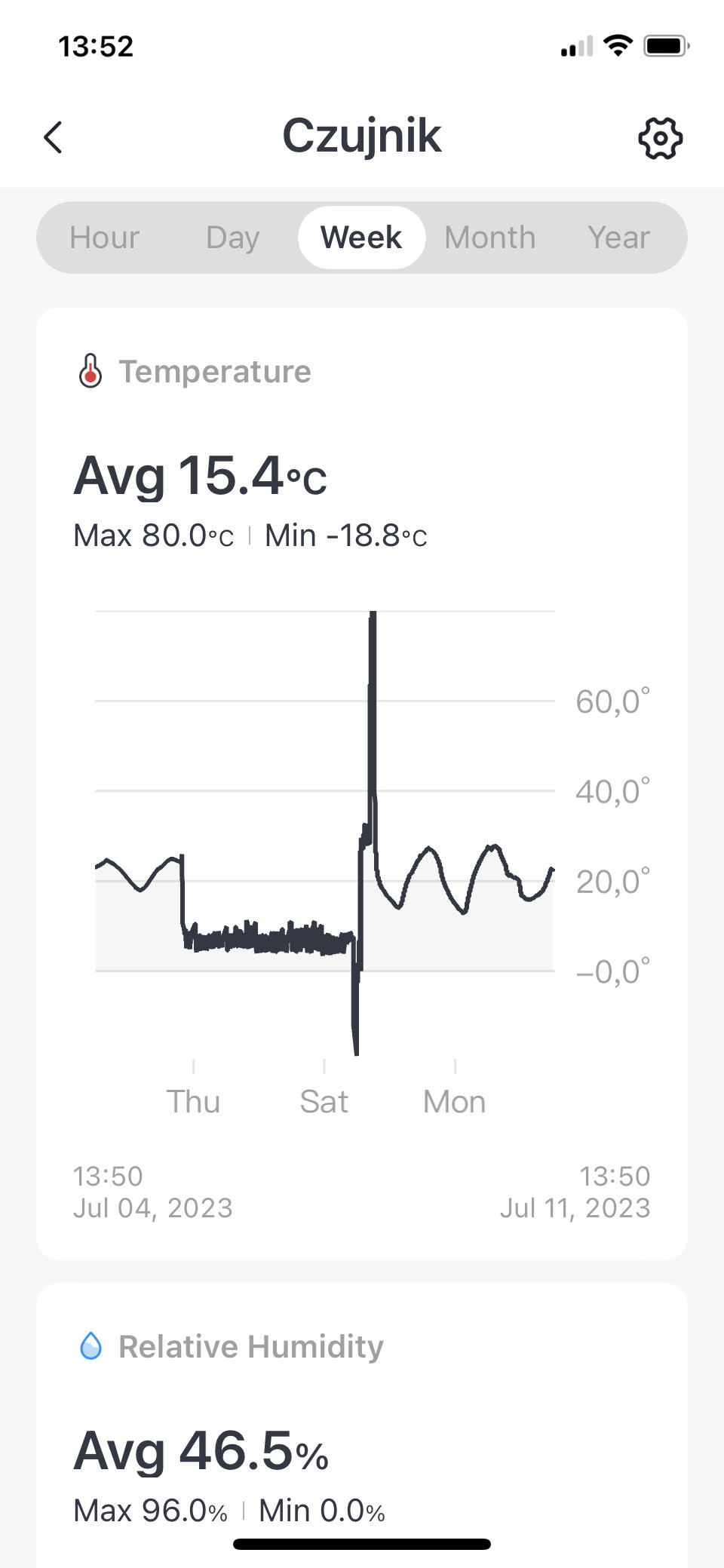Zobacz tutaj na zdjęciu – moje testy w weekend: Max temp +80, min temp -18.8, nie miałem gdzie włożyć poniżej tych 18st 😉 https://www.smartnydom.pl/wp-content/uploads/2023/07/switchbot.jpg